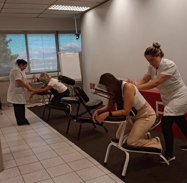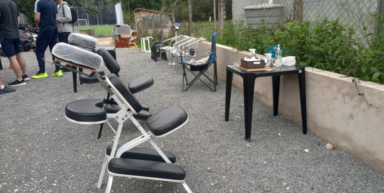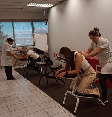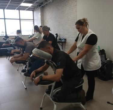 Quick Massage: É uma pausa rápida de bem-estar que ajuda a aliviar tensões e melhorar a disposição da equipe. Muitas empresas utilizam como ação de cuidado com os colaboradores ou como diferencial em eventos.